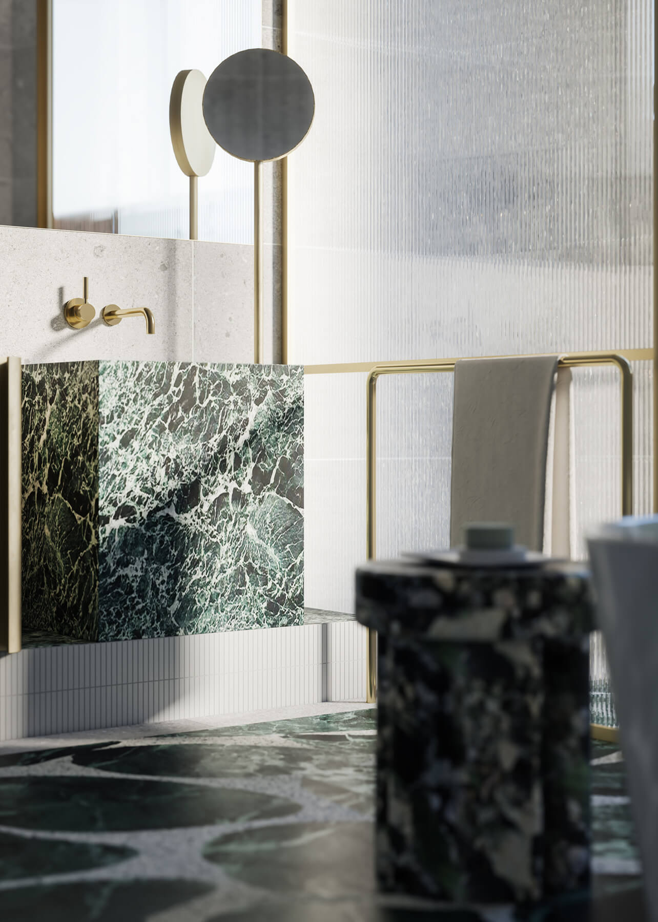 Genton was inspired by the idea of a curated space whilst designing the open-plan kitchen and dining area. Their focus was on meticulous planning and bold, beautiful finishes appointed with artful precision. The centrepiece is the island bench, a statement object formed of captivating green marble. Full-height timber joinery encompasses the space, housing an elegant bar area and sleek, European appliances.